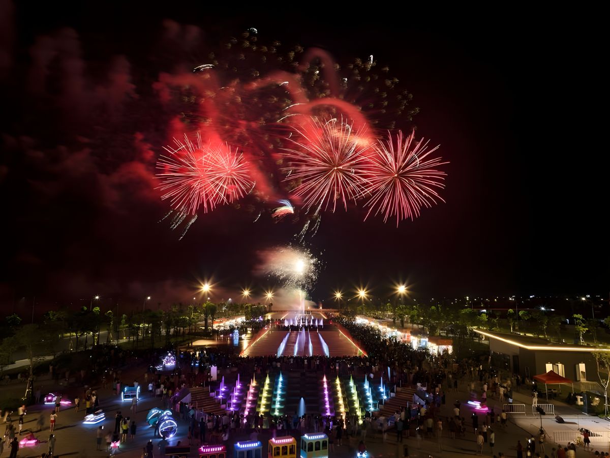 烟花与时代广场充满活力的音乐喷泉交相辉映,营造出色彩斑斓、充满情感的节日氛围。(来源:Souu tam)