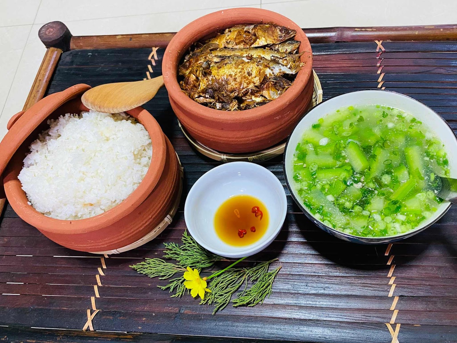 Đến trưa, hãy thưởng thức bữa cơm dân dã nhưng đậm đà với cá mòi kho chuối xanh, nơi hương vị béo thơm của cá hòa quyện cùng chuối bùi và nước kho sánh mịn sẽ khiến bữa ăn thêm phần trọn vẹn.