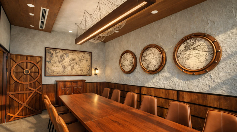 Khu ngoài trời còn gây ấn tượng với bể bơi và quầy bar được thiết kế mô phỏng hình dáng một con thuyền gỗ cổ, với các chi tiết như bánh lái, mỏ neo hay phao gỗ. Tất cả tạo nên một không gian vừa độc đáo vừa mang tinh thần tự do, rất phù hợp để “chill” vào cuối chiều hoặc buổi tối.