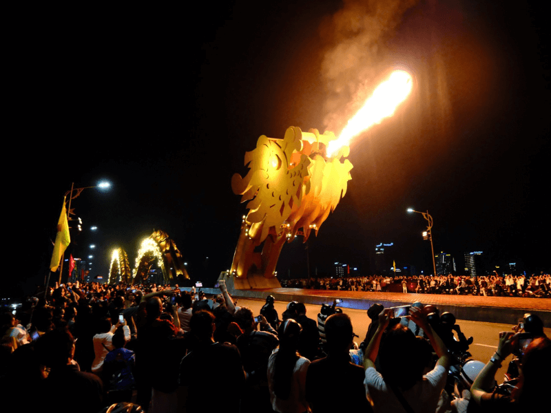 Cầu Rồng với màn trình diễn phun lửa thu hút khách du lịch. (Nguồn: Sưu tầm)