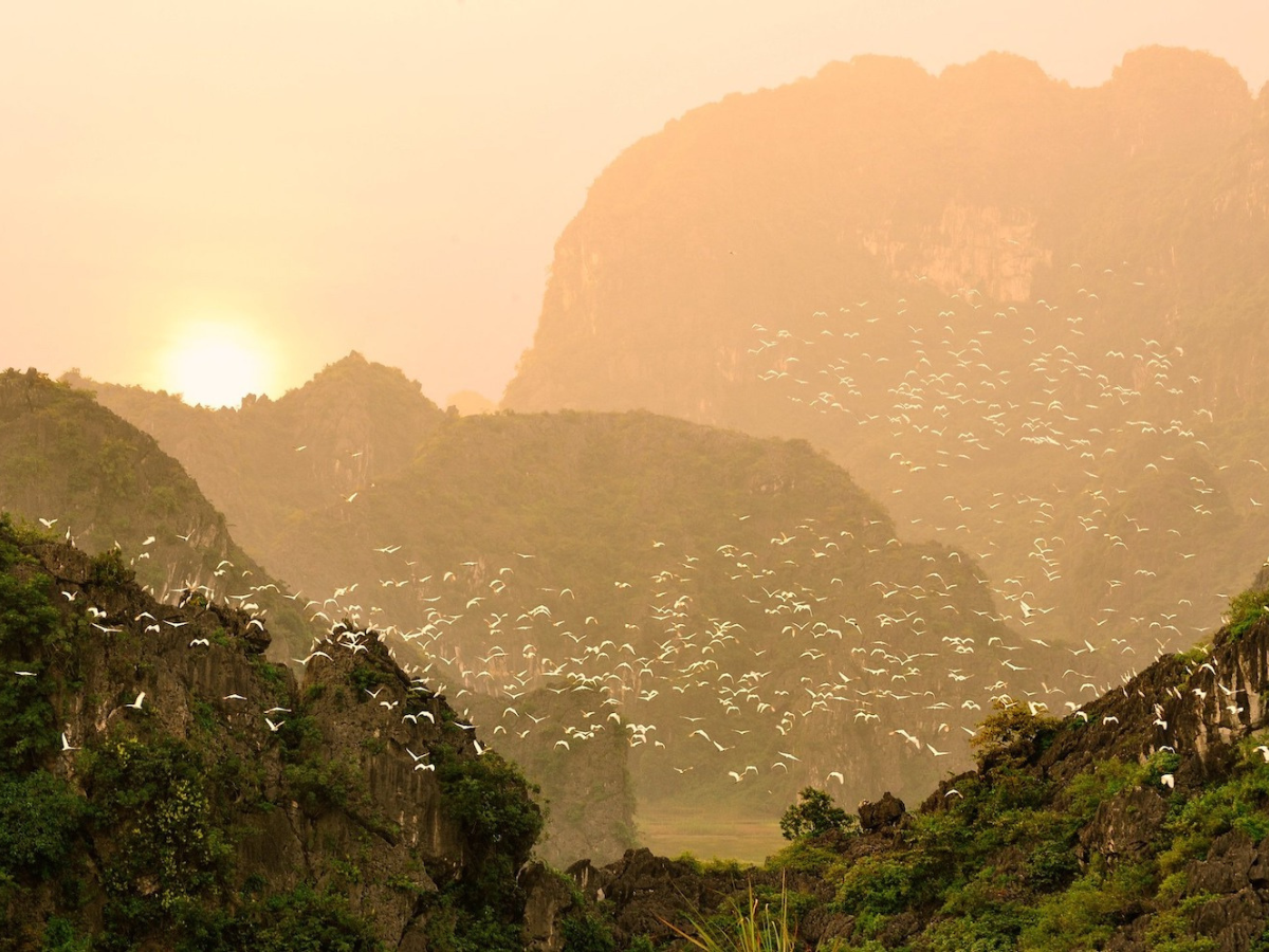 Cảnh sắc vườn chim Thung Nham đẹp nên thơ với từng đàn chim trắng bay lượn giữa trời xanh (Nguồn: Sưu tầm)