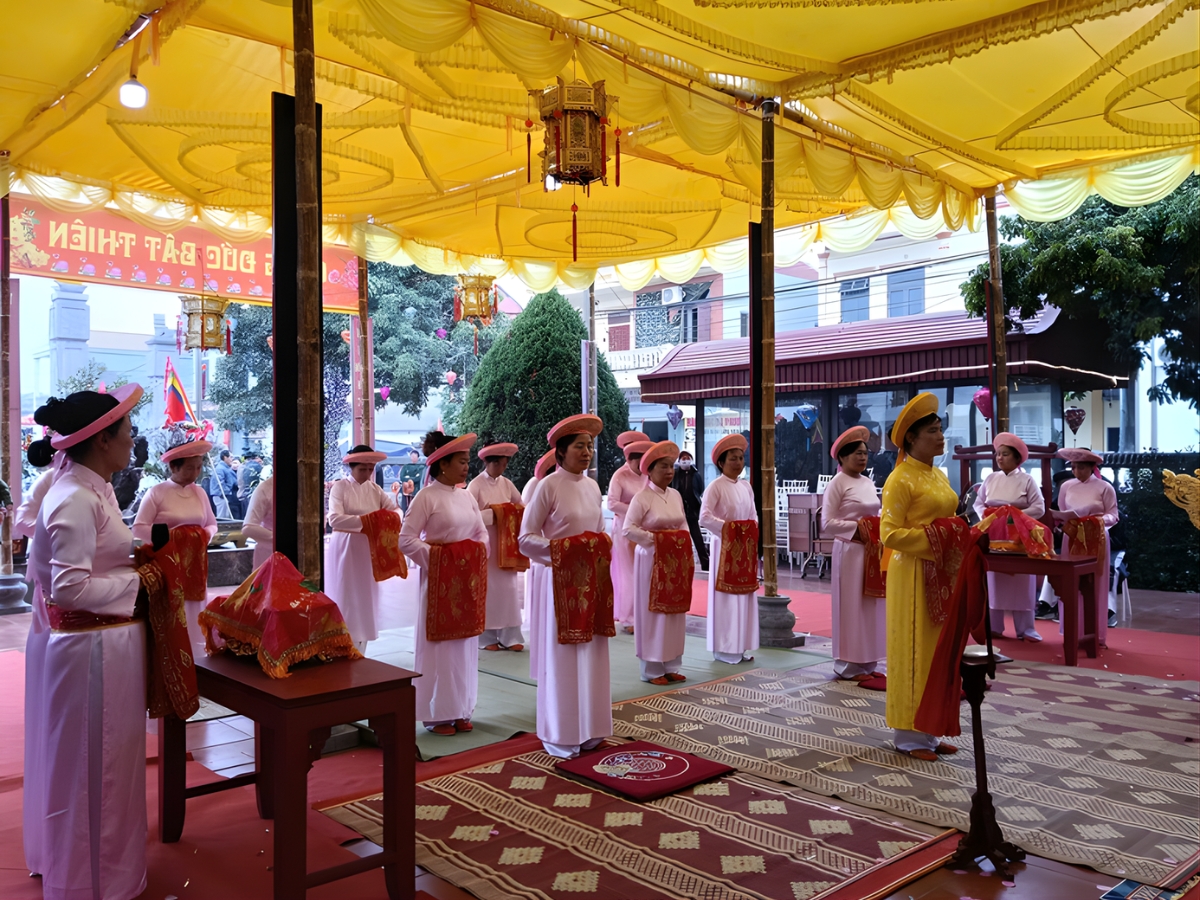 Đội tế nữ thực hiện nghi thức tế lễ trang nghiêm tại đình làng Nộn Khê. (Nguồn: Sưu tầm)