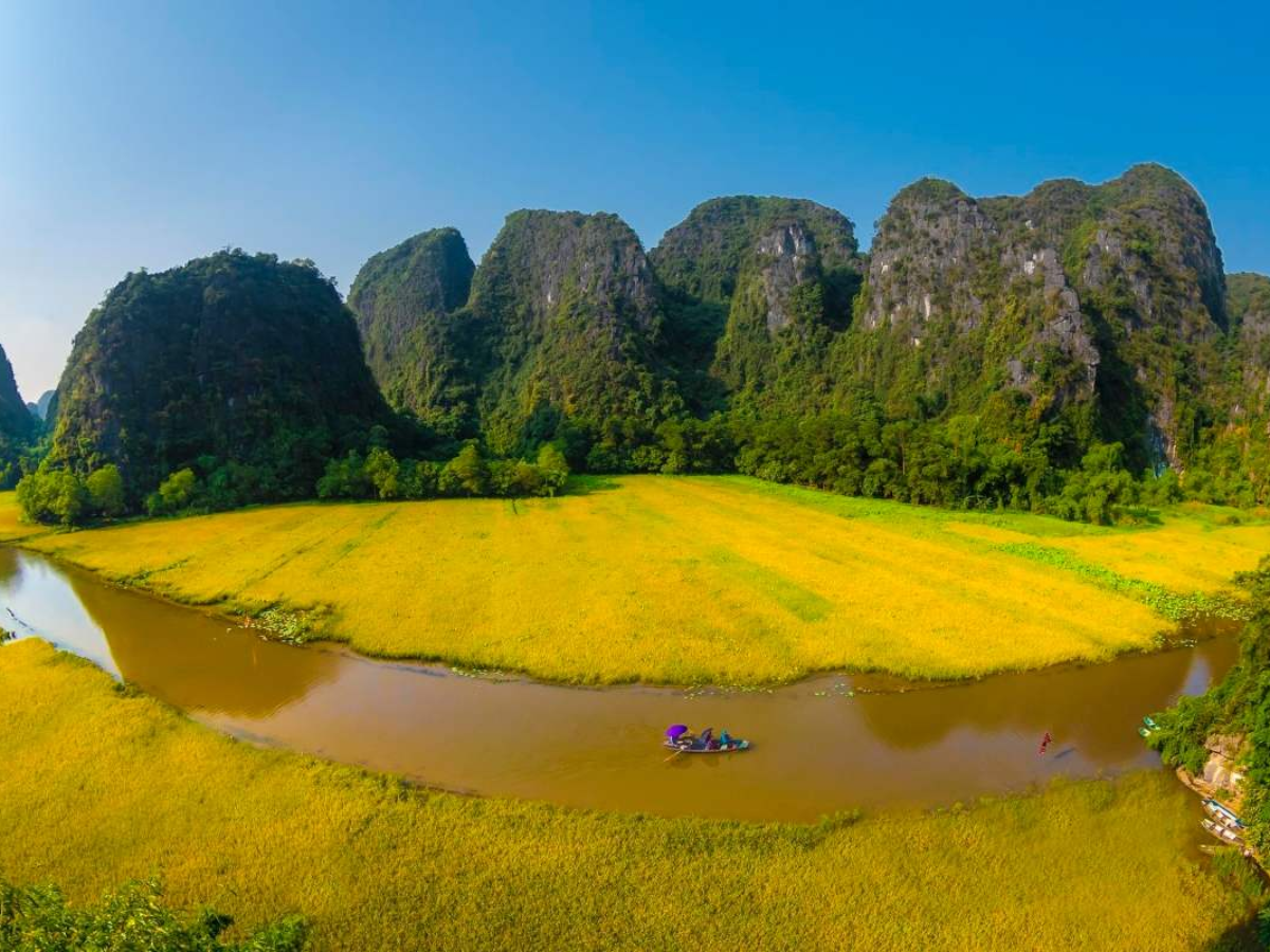 Tam Cốc đẹp nhất vào mùa lúa chín, khi cả dòng Ngô Đồng như được phủ một dải lụa vàng. Ngồi thuyền trên sông và nhìn những thửa ruộng hai bên nhuộm vàng óng, bạn sẽ hiểu vì sao thời điểm này được nhiều nhiếp ảnh gia săn đón. Tuy trời hơi nóng, nhưng đổi lại là khung cảnh hiếm có, rất đáng để trải nghiệm.