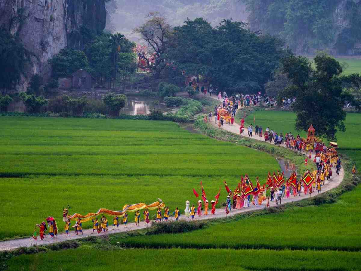 Người tham gia rước kiệu mặc lễ phục truyền thống, di chuyển trong tiếng nhạc bát âm vang vọng. Đoàn rước nối dài trên những con đường làng dẫn về đền, tạo nên khung cảnh vừa uy nghi vừa giàu tính cộng đồng. Không chỉ mang ý nghĩa tâm linh, nghi thức rước còn thể hiện sự gắn kết giữa các làng xã, cùng hướng về cội nguồn chung của vùng đất Hoa Lư.
