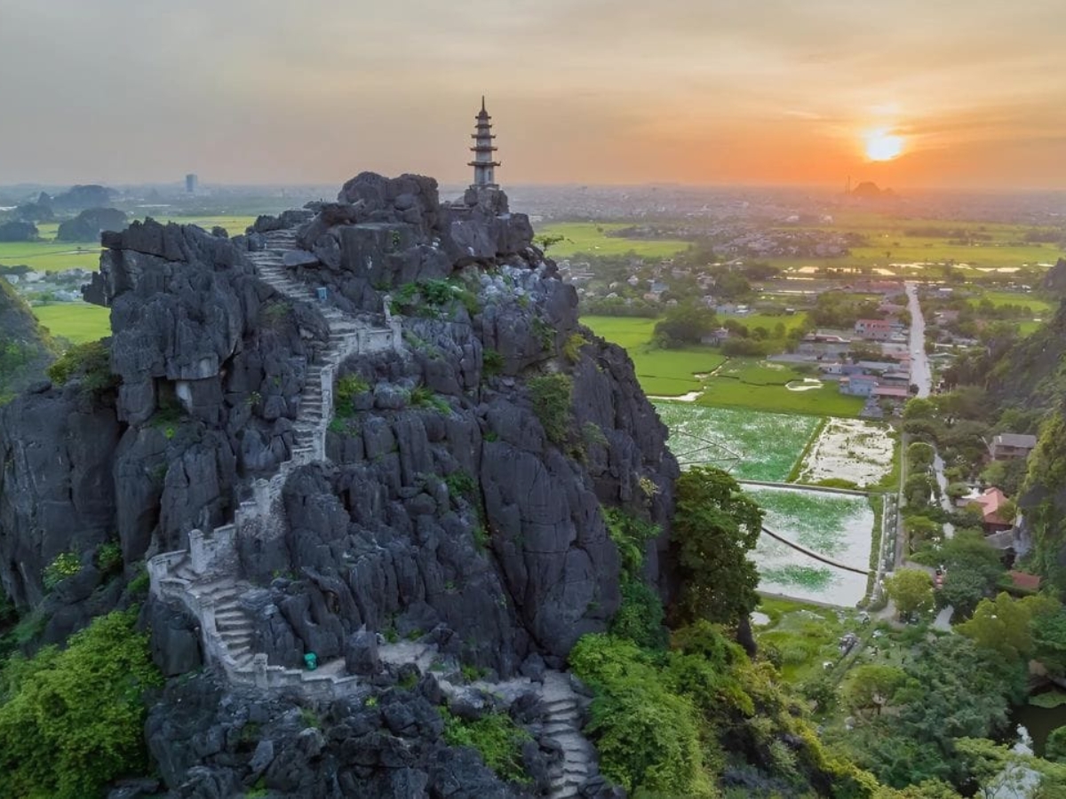 Hang Múa: Địa điểm check-in nổi tiếng, nơi du khách có thể leo lên đỉnh núi Ngọa Long để chiêm ngưỡng toàn cảnh Tam Cốc và cánh đồng lúa bát ngát phía dưới.