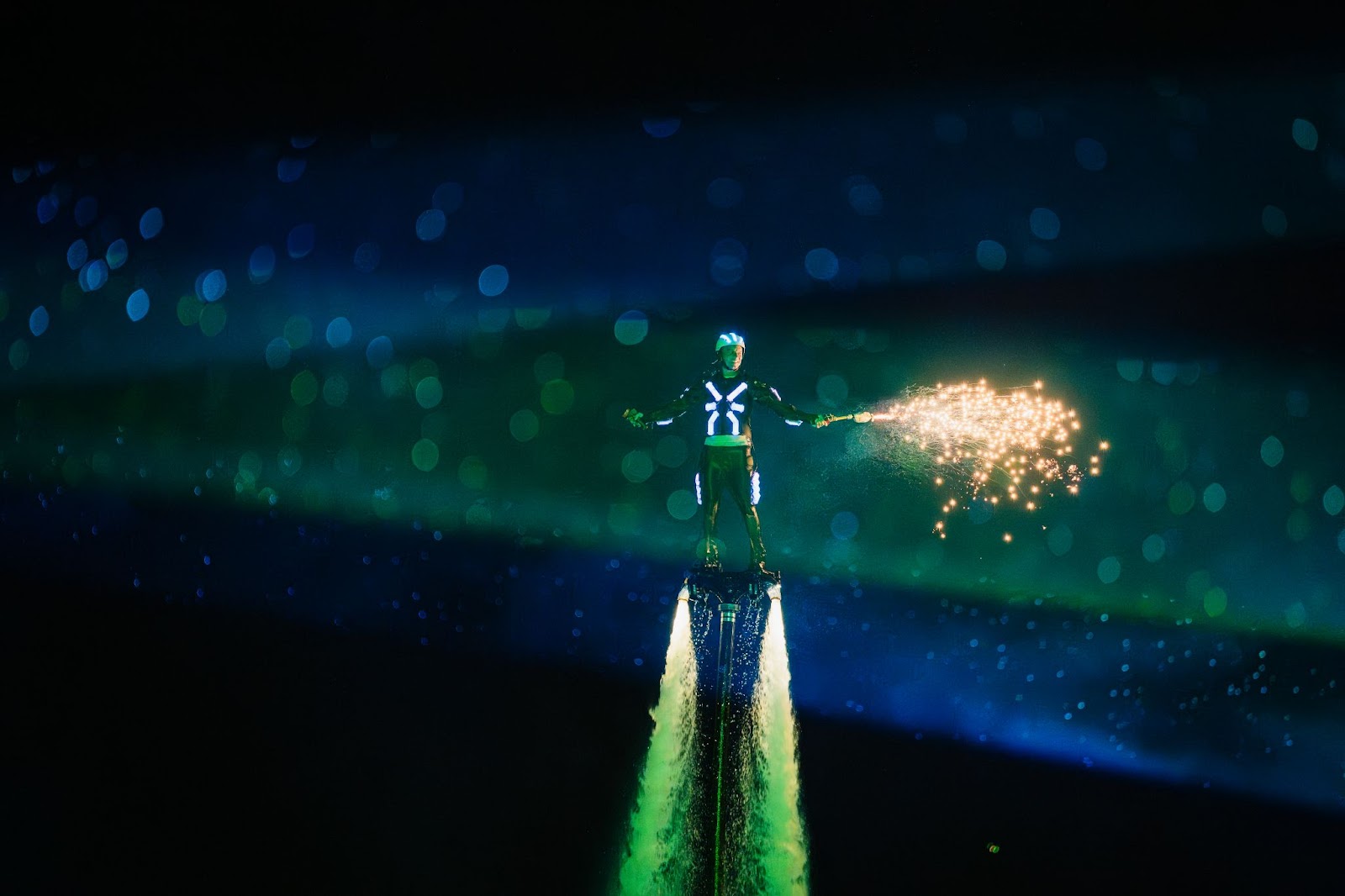 6 vận động viên Jetski tập luyện với những màn “rẽ sóng” tốc độ cao và những pha bẻ cua cực gắt khiến nhiều người đón xem buổi tập luyện không khỏi trầm trồ. Những “ngôi sao” flyboard đem đến nhiều pha nhào lộn ở độ cao 15m với trang phục đèn LED và pháo sáng, tạo nên những “thước phim điện ảnh sống động” giữa biển trời đêm.