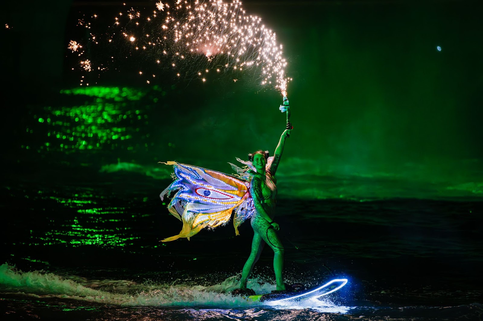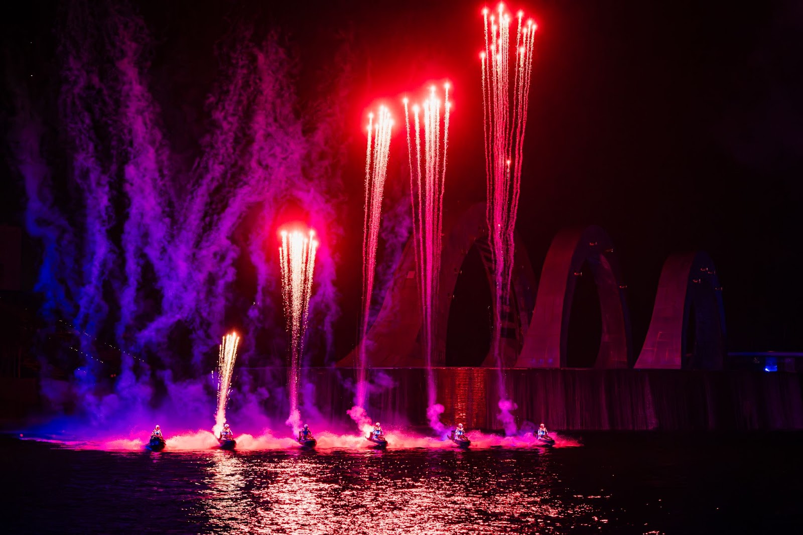 Tại vịnh biển Thị trấn Hoàng Hôn, 21 vận động viên hàng đầu thế giới bộ môn Jetski, Jetsuft và Flyboard đã phô diễn những kỹ thuật đỉnh cao với trang phục biểu diễn LED được nâng cấp hiện đại. Trong phiên bản nâng cấp năm nay, trang phục của show diễn được thiết kế bởi Bao Rong – đơn vị thiết kế phục trang danh tiếng từng hợp tác với các sự kiện quốc tế và nhiều tên tuổi lớn như đạo diễn Trương Nghệ Mưu.