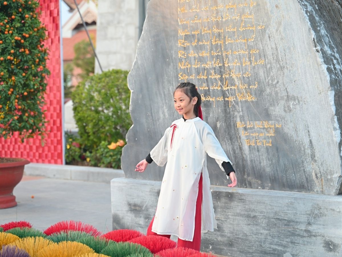 Trang phục truyền thống như áo dài lụa tông đỏ, vàng, hồng phấn rất hợp lý khi tới các điểm check in Quảng Ninh ngày Tết.
