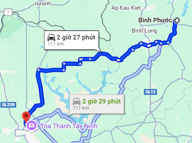 Nhiều người lựa chọn tuyến đường này khi muốn tìm hiểu Tây Ninh cách Bình Phước bao nhiêu km. Quãng đường gần nhất khoảng 111 km, bắt đầu từ trung tâm Đồng Xoài, tiếp tục di chuyển theo hướng Quốc lộ 13 về phía Chơn Thành. Kế tiếp, bạn đi tiếp trên Quốc lộ 22B rồi rẽ sang ĐT781 để đến Tân Châu, Tây Ninh. Đường được trải nhựa phẳng phiu, biển báo rõ ràng, thích hợp cho cả xe gắn máy, ô tô cá nhân và xe khách. Trên suốt cung đường, hai bên là cây xanh và cánh đồng trải dài, tạo nên không khí dễ chịu, thư thái cho chuyến đi.