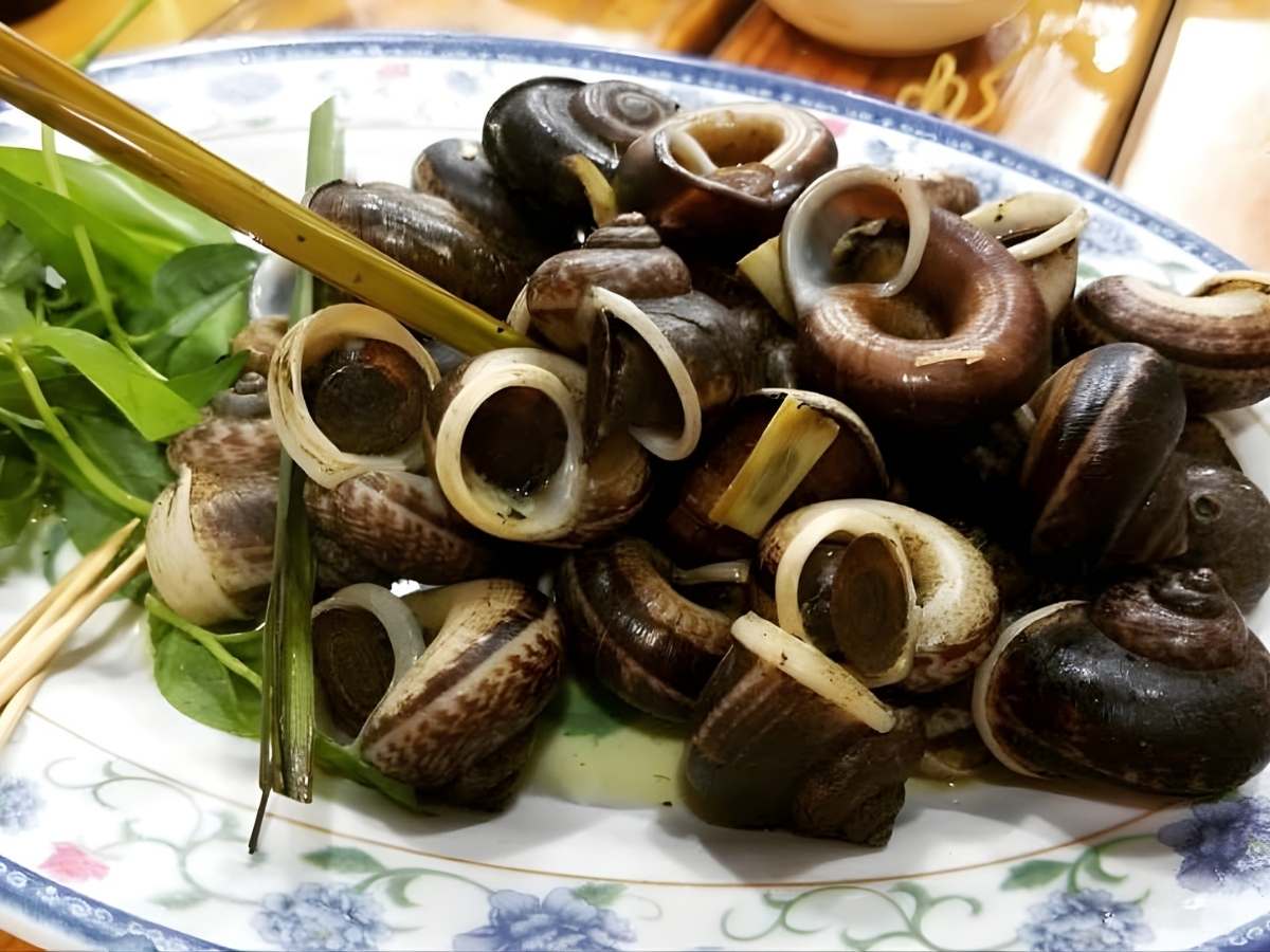 Mountain snails are a quite unique specialty of the limestone mountain region of Ninh Binh, usually only appearing during the rainy season. These snails live in rock caves, so their meat is crispy, sweet, and carries a light aroma of forest leaves. Snails can be processed into many dishes such as steamed snails with lemongrass, stir-fried snails with tamarind, or grilled snails, offering an interesting culinary experience for tourists. If you want to try this specialty dish, you can visit Trung Tuyet Restaurant, Duc De Restaurant, or Chinh Thu Restaurant, familiar places for many tourists visiting Ninh Binh.