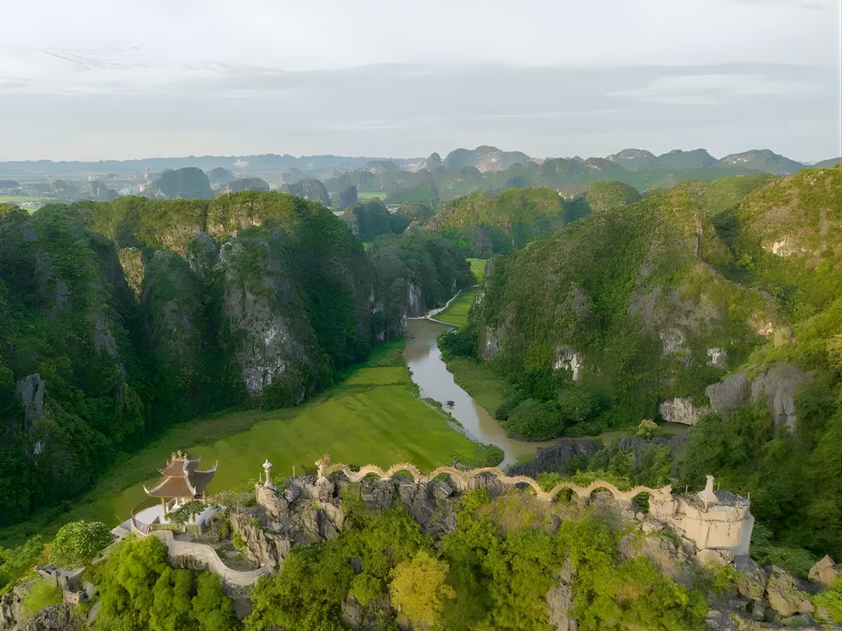 Ninh Binh has long been known as the "Ha Long Bay on land" thanks to its majestic limestone mountain landscape rising amidst fields and gently winding rivers. Hundreds of millions of years old limestone mountains create a magnificent natural picture, combined with a system of caves and rivers, creating a landscape that is both wild and poetic. The harmony between mountains, water, and rice fields has given this place a unique beauty rarely found elsewhere.