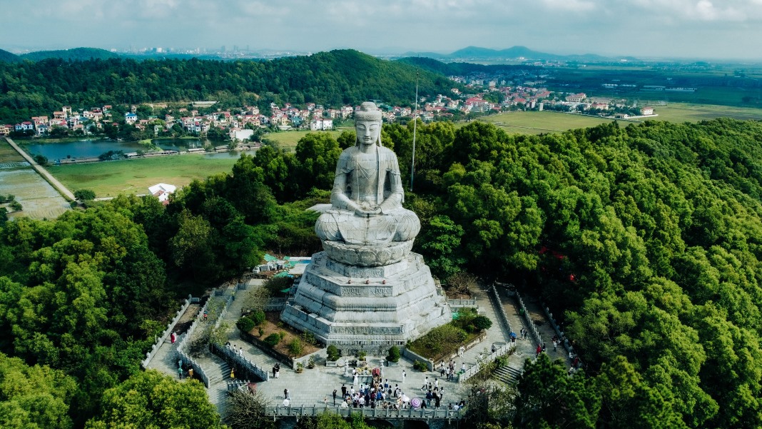 Located just a short drive from Hanoi, Phat Tich Mountain offers a culturally profound Vietnam Buddha statue mountain experience, anchored by the monumental Amitabha Buddha Statue at Van Phuc Pagoda. Situated on the mountain’s southern slope, this masterpiece is distinguished by its material, being carved from monolithic green stone with a staggering weight of nearly 3,000 tons and standing 27 meters high.
