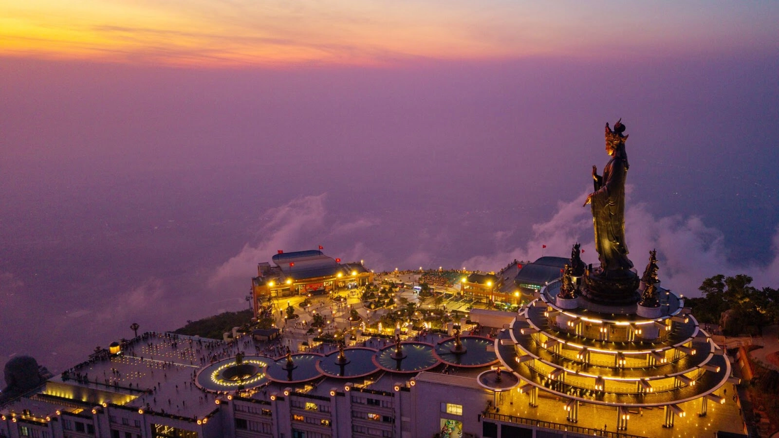 On the night of the Full Moon of the First Lunar Month, the peak of Black Lady Mountain turns into a sea of lights with the grand lamp offering ceremony taking place from early afternoon until evening. Thousands of lamps are lit, sparkling around the square and the path leading up to the Buddha statue, creating a mystical and solemn scene.