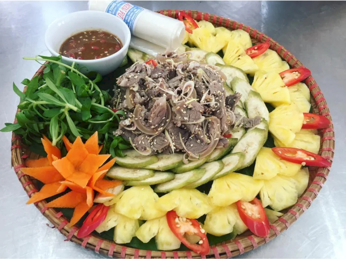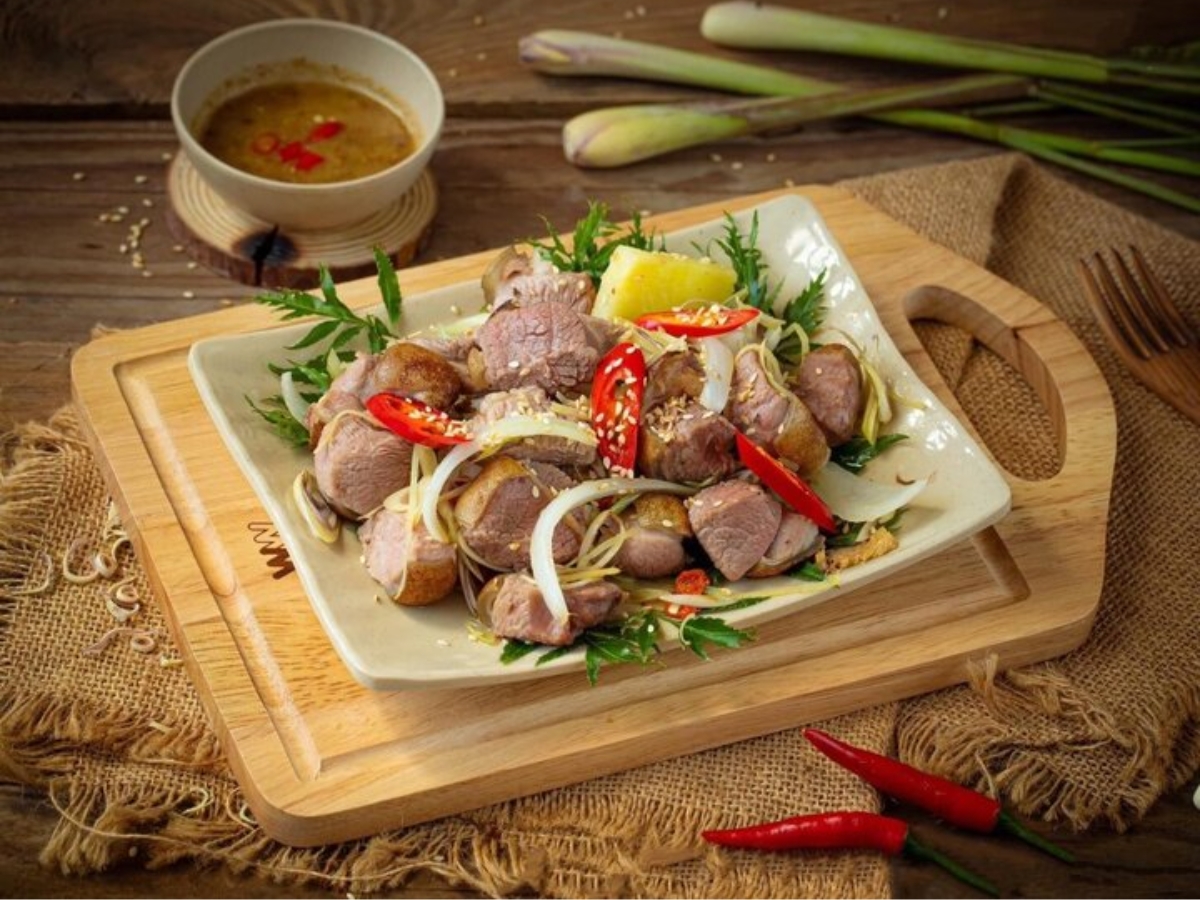 Among many preparation methods, the lime-marinated goat dish is always popular. Fresh goat meat is thinly sliced, quickly blanched in boiling water, then mixed with lime juice, herbs, and spices. This method preserves the original fresh and sweet taste. Additionally, steamed goat, grilled goat, goat hot pot, and stir-fried goat with lemongrass and chili are also other attractive options.