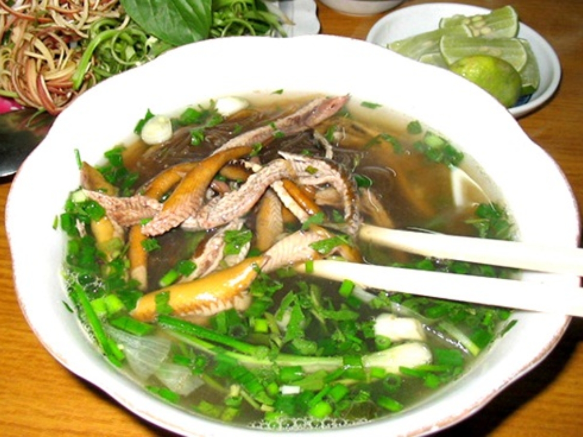 The eels used for this dish are carefully selected, usually raised in brackish water areas in Ninh Binh and Thanh Hoa, finger-sized, with a reddish-brown back and yellow belly. The eel meat, after being meticulously filleted, is braised according to a secret recipe, creating a very distinctive flavor: fragrant, fatty, and richly sweet. As for the noodles, the makers choose those made from pure local arrowroot, unadulterated, with thin, even, and transparent strands. The noodles are washed, briefly blanched in boiling water, then dipped back into the hot broth so the strands expand just enough and absorb the quintessence of the broth's flavor.