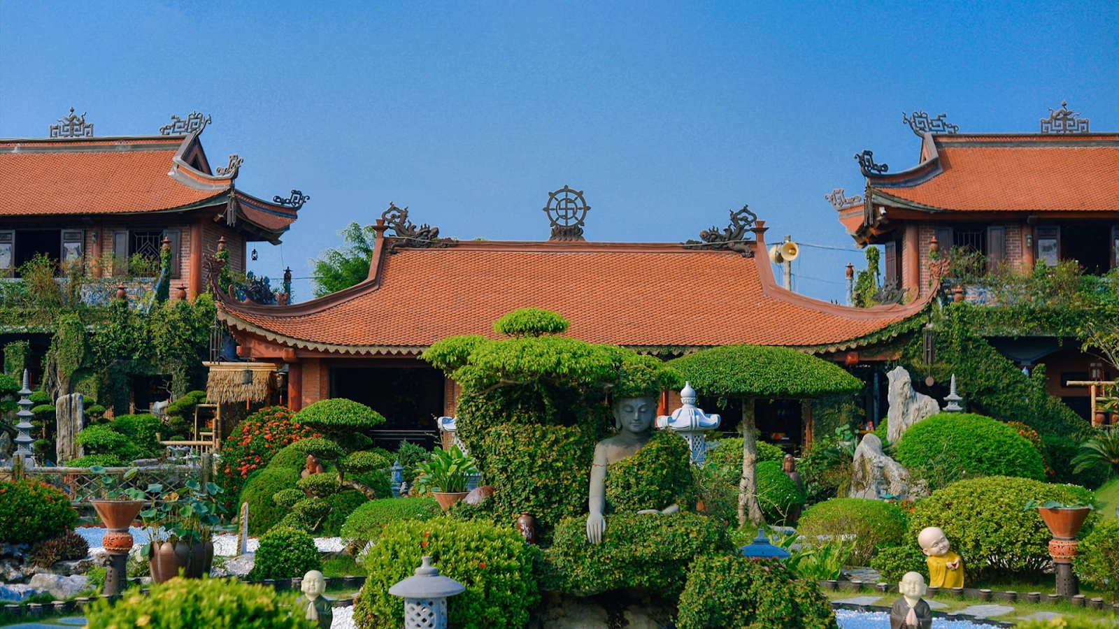 The temple's unique feature lies in the harmony between Japanese architecture and Vietnamese identity. Structures such as the main hall, the ancestral house, the tea pavilion, or the lecture hall still retain their Vietnamese soul through intricate carvings on precious wood, with skillfully combined motifs of lotuses, clouds, and natural stones. This combination creates an overall atmosphere that is both solemn and intimate.