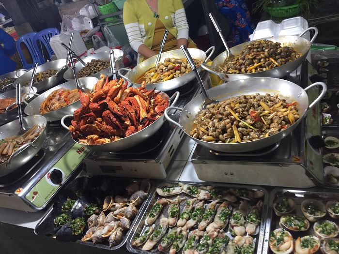 वंग ताऊ पैदल यात्री सड़क पर पर्यटकों को आकर्षित करने वाले स्वादिष्ट ताज़े समुद्री भोजन के स्टॉल (स्रोत: संकलित)