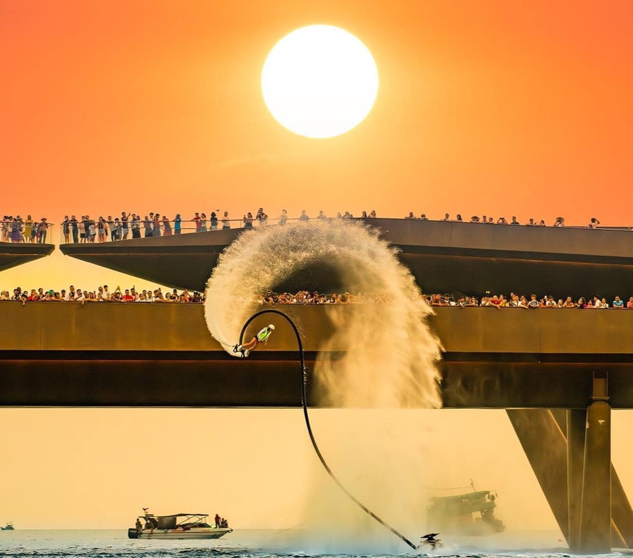 황혼 아래 펼쳐지는 숨 막히는 제트스키, 플라이보드 공연