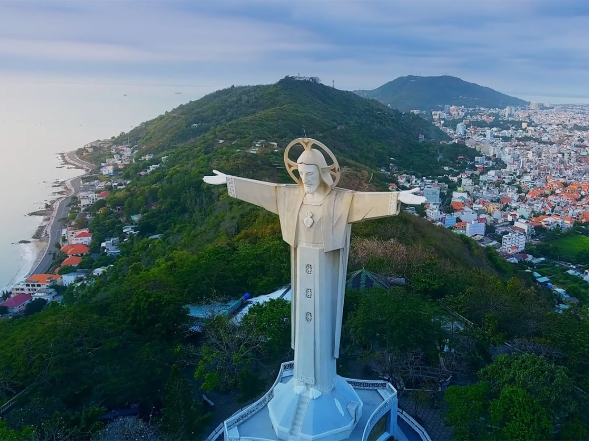 해발 170m 타오 풍 언덕 꼭대기에 우뚝 솟은 예수 그리스도 왕상은 2026년 4월 30일 휴가철 붕따우 여행에서 빼놓을 수 없는 명소입니다. 높이 32m, 팔 길이 18.4m의 이 건축물 내부에는 133개의 나선형 계단이 있어 조각상의 어깨까지 올라갈 수 있으며, 이곳에서 관광객들은 만과 도시의 전경을 한눈에 담을 수 있습니다.