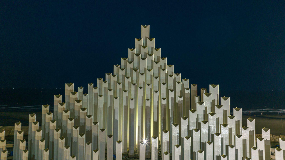 이 타워는 4.55m에서 34.25m 이상까지의 143개 기둥으로 구성되어 있으며, 바다를 향해 점차 높아지도록 배열되어 있습니다. 이는 세 척의 강력한 배가 바다로 나아가는 이미지를 형상화한 것으로, 자롱 왕(King Gia Long) 시대부터 해양과 섬을 보호하는 사명을 지닌 Thang Nhat, Thang Nhi, Thang Tam 세 마을의 이야기를 재현합니다. 탐탕 광장(Tam Thang Square)은 바이 사우(Bai Sau) 지역에 다기능 커뮤니티 공간으로 설계되었으며, 높이 3.6m의 봉깐곶(Vong Canh Cape)은 해안 도시의 탁 트인 전망을 제공합니다.