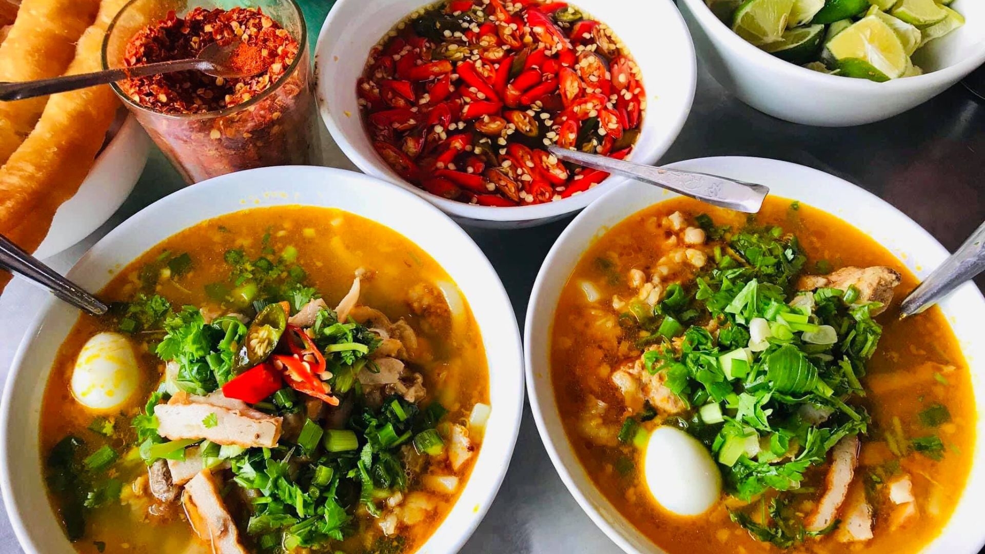 Thực khách có thể cho thêm các gia vị trước khi thưởng thức tô bánh canh ruộng thơm ngon. (Nguồn: Sưu tầm)