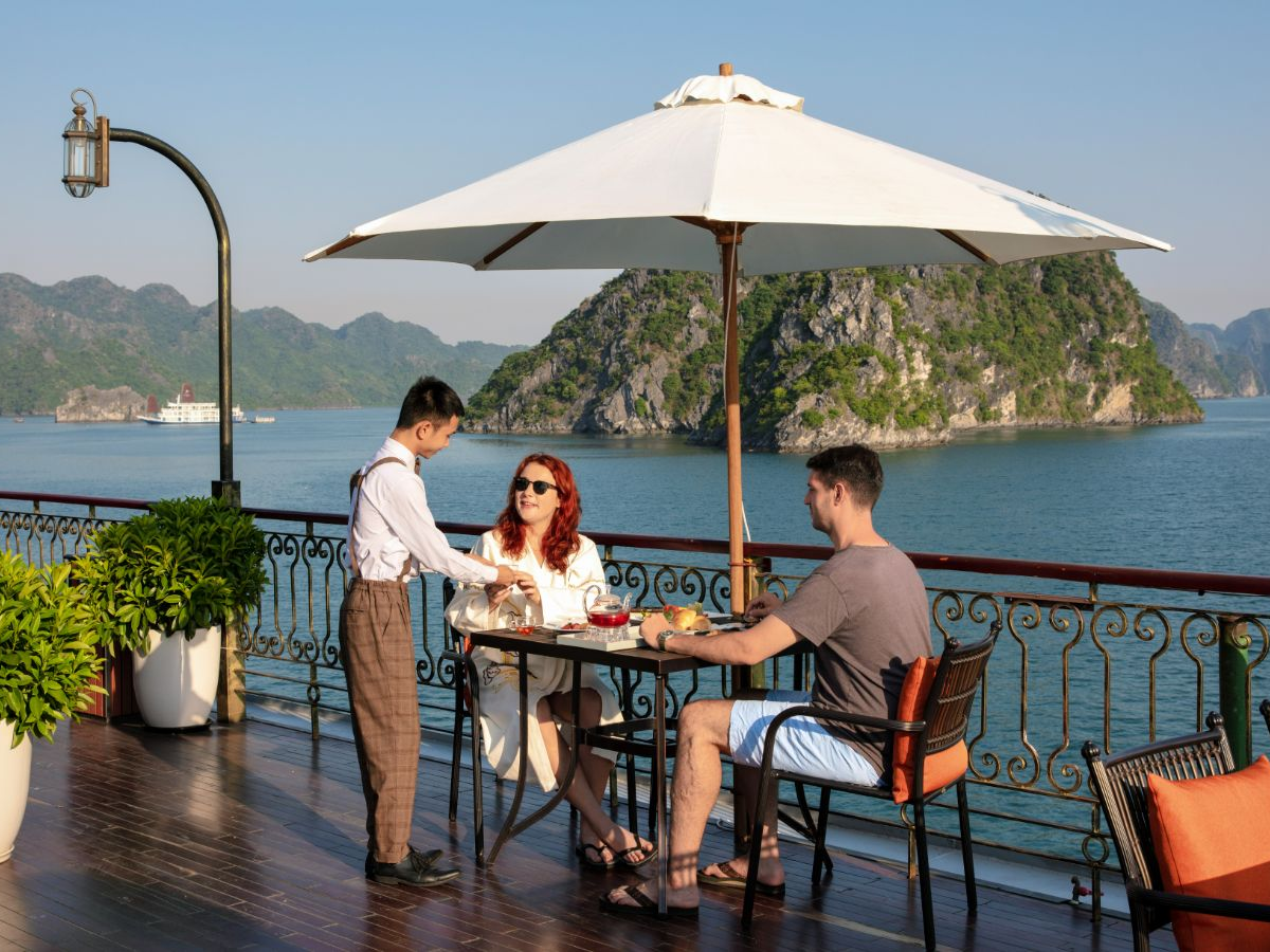 Thực đơn trên du thuyền phong phú, kết hợp tinh tế giữa ẩm thực Việt và món Âu, nổi bật nhất là các món hải sản tươi sống được chế biến ngay tại chỗ. Bữa ăn phục vụ theo hình thức buffet với đa dạng món nóng, salad, đồ nướng và hải sản hấp. Đặc biệt, du khách còn được thưởng thức tiệc trà chiều hấp dẫn với trái cây tươi, bánh ngọt và nước ép, tạo nên hành trình trọn vẹn giữa khung cảnh hoàng hôn trên biển.