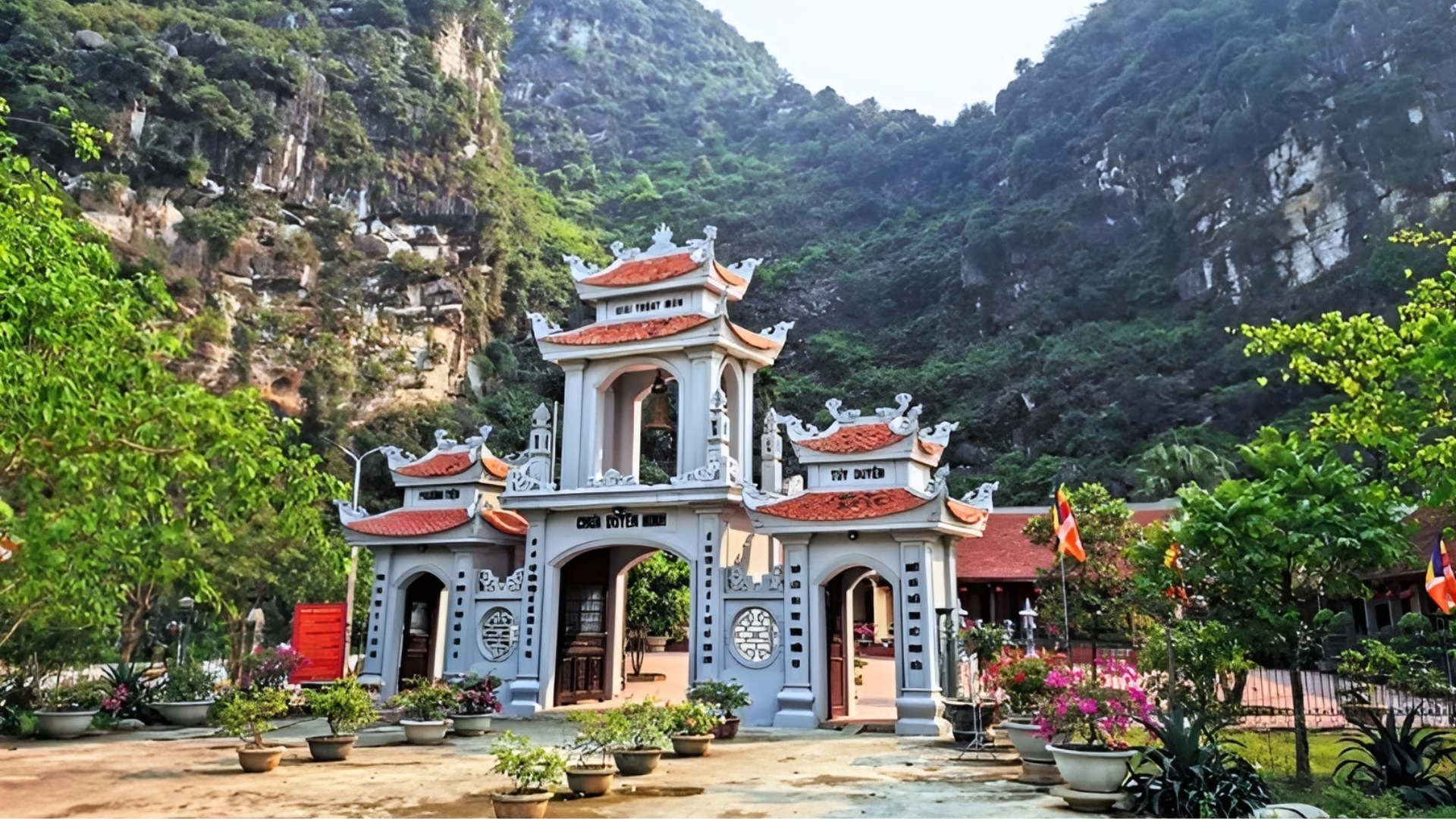Từ khu vực sân chùa, du khách có thể thỏa sức ngắm nhìn toàn cảnh non nước hữu tình của Ninh Bình với những dãy núi trùng điệp, tạo nên cảnh sắc nên thơ khó phai.