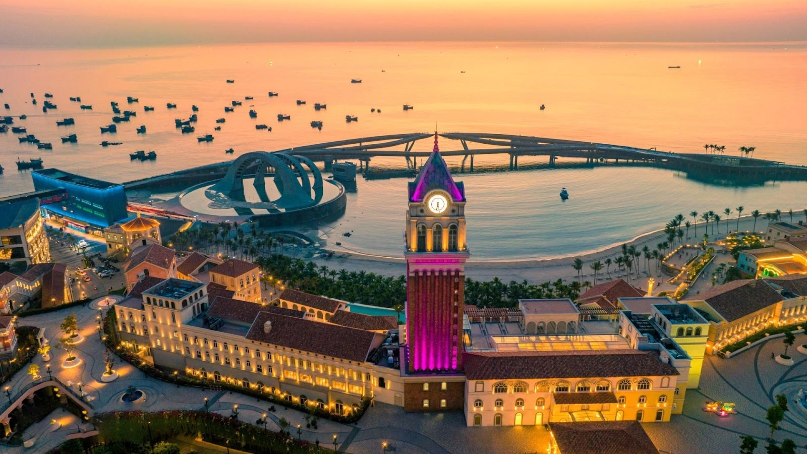 Một trong những điểm nhấn nổi bật tại đây là Cầu Hôn, nơi hai nhánh cầu vươn ra biển gần chạm vào nhau trong khoảnh khắc mặt trời lặn. Khi đêm xuống, du khách có thể thưởng thức chương trình nghệ thuật “Symphony of the Sea – Bản giao hưởng đại dương” mùa 2 với sự kết hợp giữa âm nhạc, ánh sáng và hiệu ứng nước sống động, mang đến trải nghiệm khó quên.