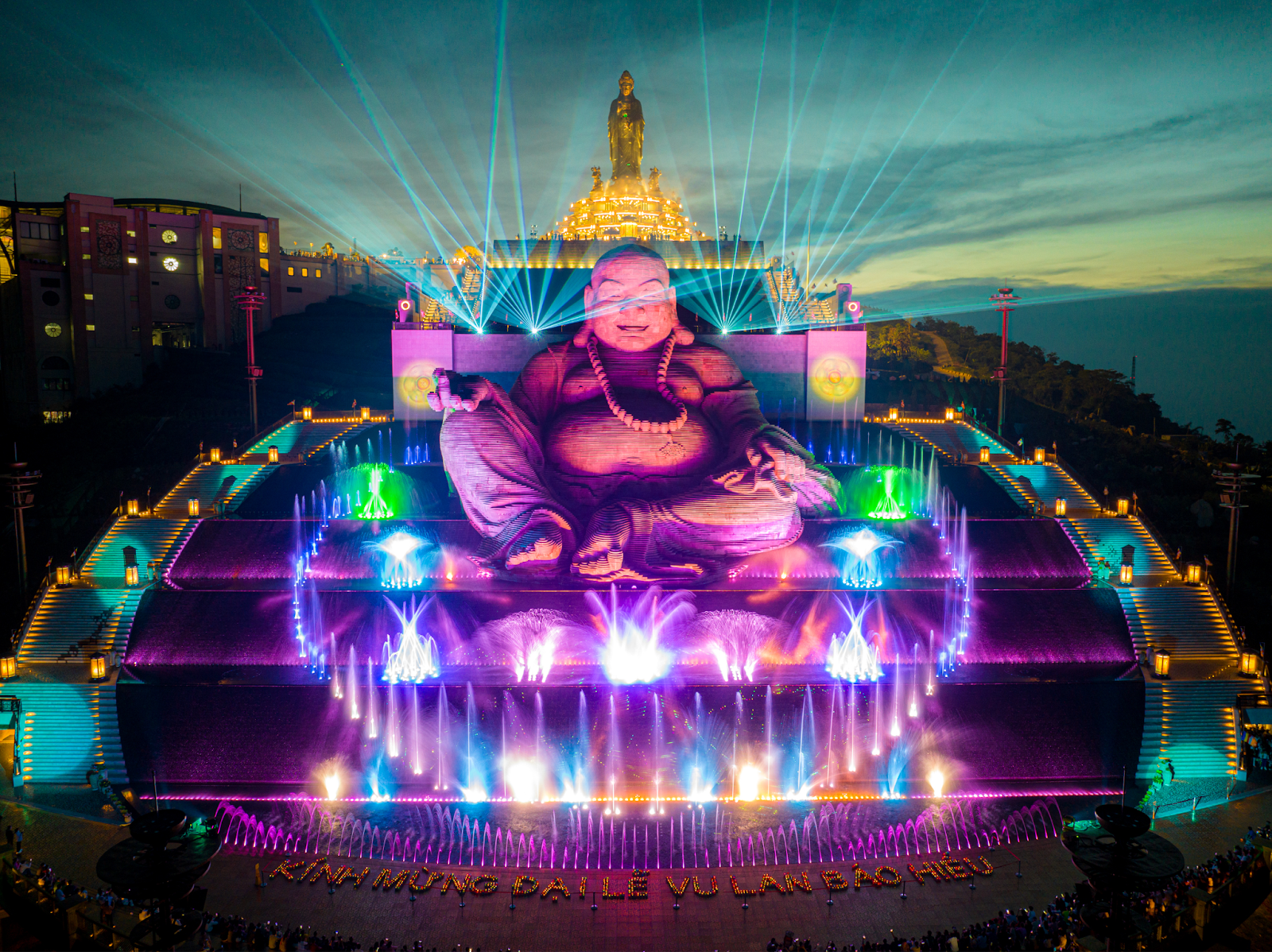 Tượng Đức Phật Di Lặc tỏa sáng lung linh trong không gian đêm. (Nguồn: Sưu tầm)