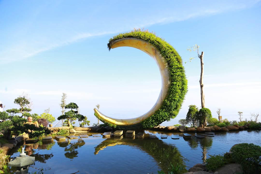 Từ Vườn Vô Ngã, bạn còn có thể thu trọn tầm nhìn toàn cảnh Tây Ninh xanh mướt vào ban ngày và lung linh ánh đèn khi đêm xuống. Điểm nhấn nổi bật là tiểu cảnh Yển Nguyệt cao 5m: góc check-in thơ mộng để lưu giữ những khoảnh khắc đáng nhớ giữa thiên nhiên hùng vĩ của đỉnh Bà Đen.