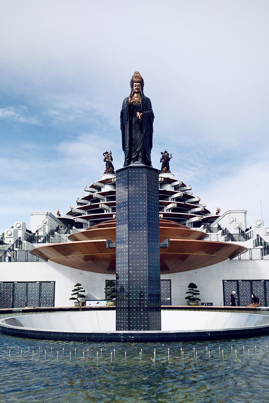 Đứng uy nghiêm trên đài sen bằng đồng được tạo hình mây và ba giọt nước cầu mong mưa thuận gió hòa, xung quanh là bốn tượng Tứ Đại Thiên Vương bảo hộ Phật pháp, tôn tượng không chỉ gây ấn tượng bởi vẻ đẹp trang nghiêm mà còn xác lập kỷ lục Tượng Phật Bà bằng đồng cao nhất Châu Á tọa lạc trên đỉnh núi.