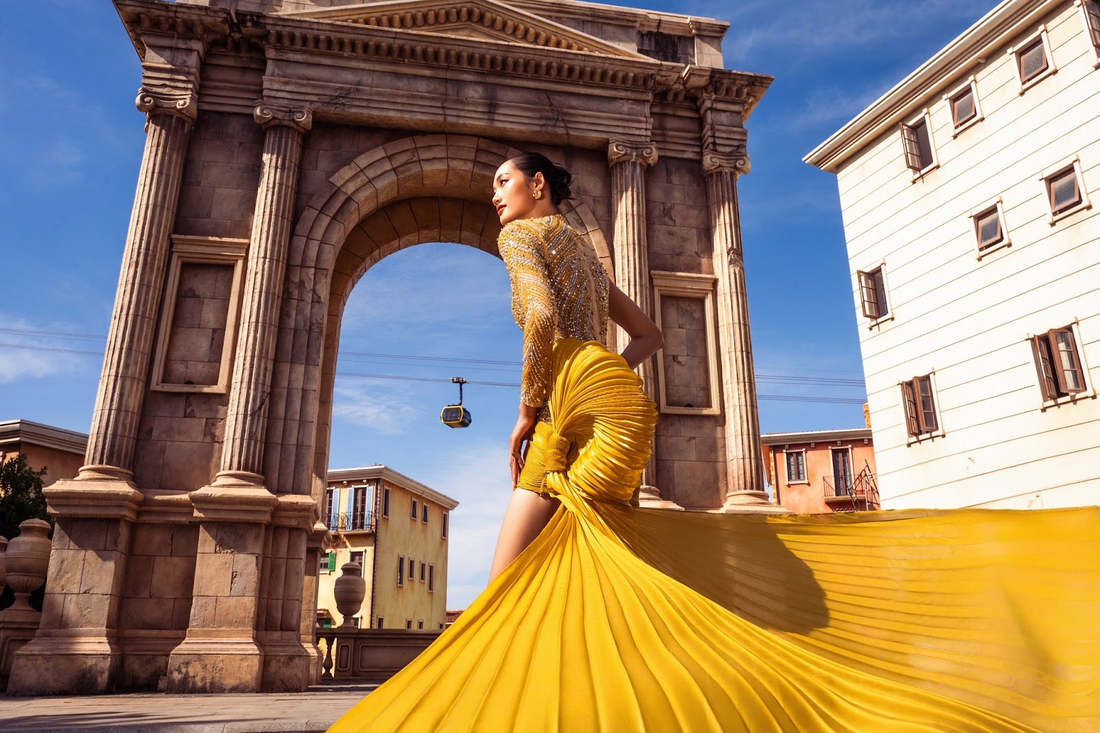 Cổng Khải Hoàn Môn tại Sunset Town là kiệt tác kiến trúc độc đáo, gợi nhắc vẻ đẹp tráng lệ của Khải Hoàn Môn Paris. Nơi đây là điểm chụp ảnh Phú Quốc lý tưởng dành cho những du khách Hàn Quốc say mê kiến trúc và yêu thích lịch sử. Với khung cảnh lãng mạn và góc chụp độc đáo, Cổng Khải Hoàn Môn đã trở thành địa điểm lý tưởng cho các cặp đôi lưu giữ khoảnh khắc hạnh phúc trong những bộ ảnh cưới đầy ấn tượng.