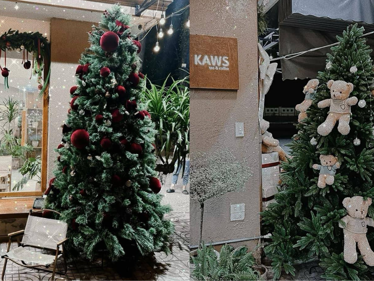 Kaws Tea & Coffee trang trí Noel theo hướng dễ thương, rực rỡ, cực hợp với giới trẻ. Những cây thông trang trí lấp lánh, dây đèn dài, các tiểu cảnh mini, sticker chủ đề Noel được dán khắp kính, kết hợp với tông trắng – đỏ chủ đạo tạo nên cảm giác vui tươi đúng chất lễ hội.