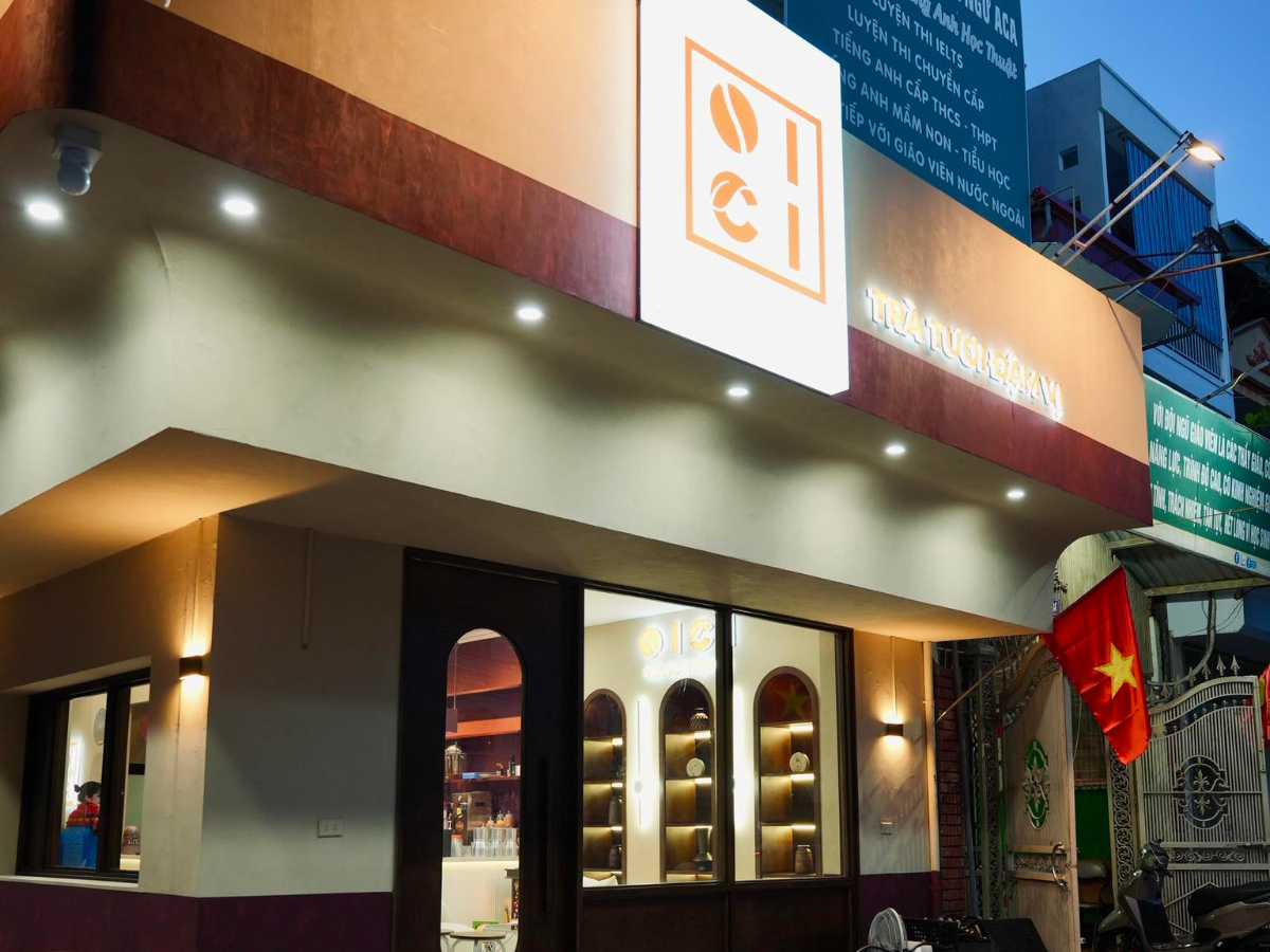 Oici gây ấn tượng bởi phong cách trang trí tinh tế, hiện đại. Khi bước vào mùa Giáng sinh, quán chọn tone nâu – đỏ – xanh rêu làm chủ đạo, tạo sự sang trọng khác biệt. Từng góc nhỏ đều được chăm chút: cây thông phong cách Scandinavian, vòng nguyệt quế và nơ khổng lồ treo cửa, nến thơm và đèn vàng tạo vibe ấm áp vô cùng.