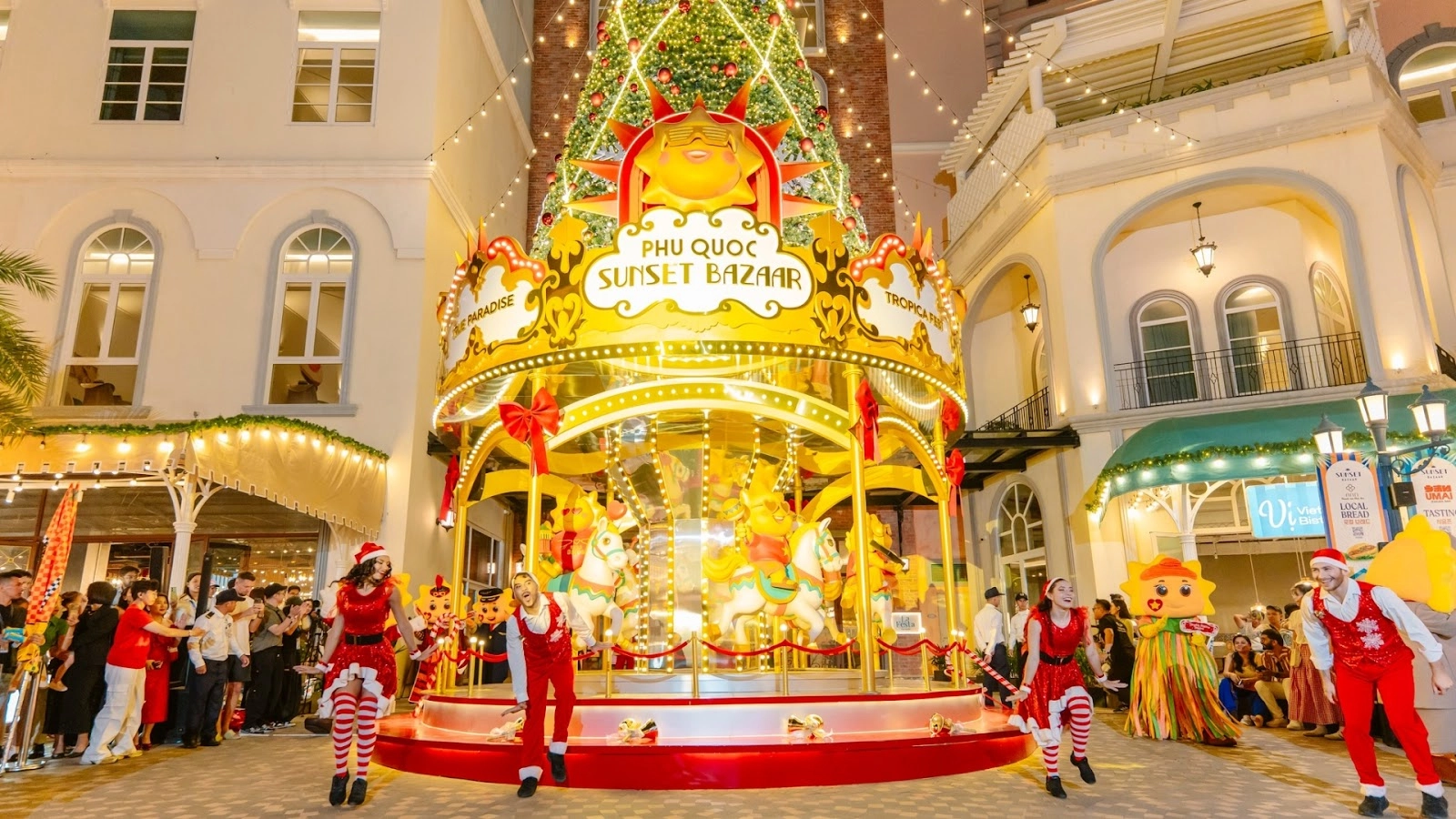Tâm điểm của mùa Noel tại đây chính là Sunset Bazaar, nơi cây thông Giáng sinh khổng lồ và vòng quay ngựa gỗ mang hình ảnh linh vật Sunny thu hút mọi ánh nhìn. Khoảnh khắc ánh đèn được thắp sáng đồng loạt không chỉ đánh dấu thời điểm Phú Quốc bước vào mùa lễ hội cuối năm, mà còn tạo nên khung cảnh check-in ấn tượng cho du khách. Xung quanh khu phố, các cửa hàng, quán ăn đều được trang trí theo chủ đề Noel, mang đến cảm giác như đang lạc vào một khu chợ Giáng sinh châu Âu giữa biển trời nhiệt đới.