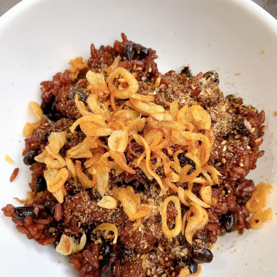 Cuối cùng, khi xôi đã chín dẻo, tắt bếp và múc ra bát, ăn kèm hành phi vàng giòn và muối vừng thơm bùi. Chỉ với vài bước đơn giản, bạn đã có ngay bát xôi đỗ đen chuẩn hương vị đất cảng, dẻo thơm và vô cùng hấp dẫn.