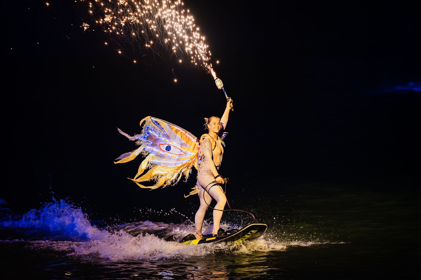 海洋交響曲(Symphony of the Sea)被視為目前富國島最熱鬧、最充滿能量的戶外演出之一,也是南島極具代表性的 富國島 表演 秀。整場節目在日落灣的海面上演出,觀眾能近距離欣賞國際運動員帶來的水上摩托 、飛板 與衝浪板等高難度特技,在遼闊海面上展現速度與技巧。